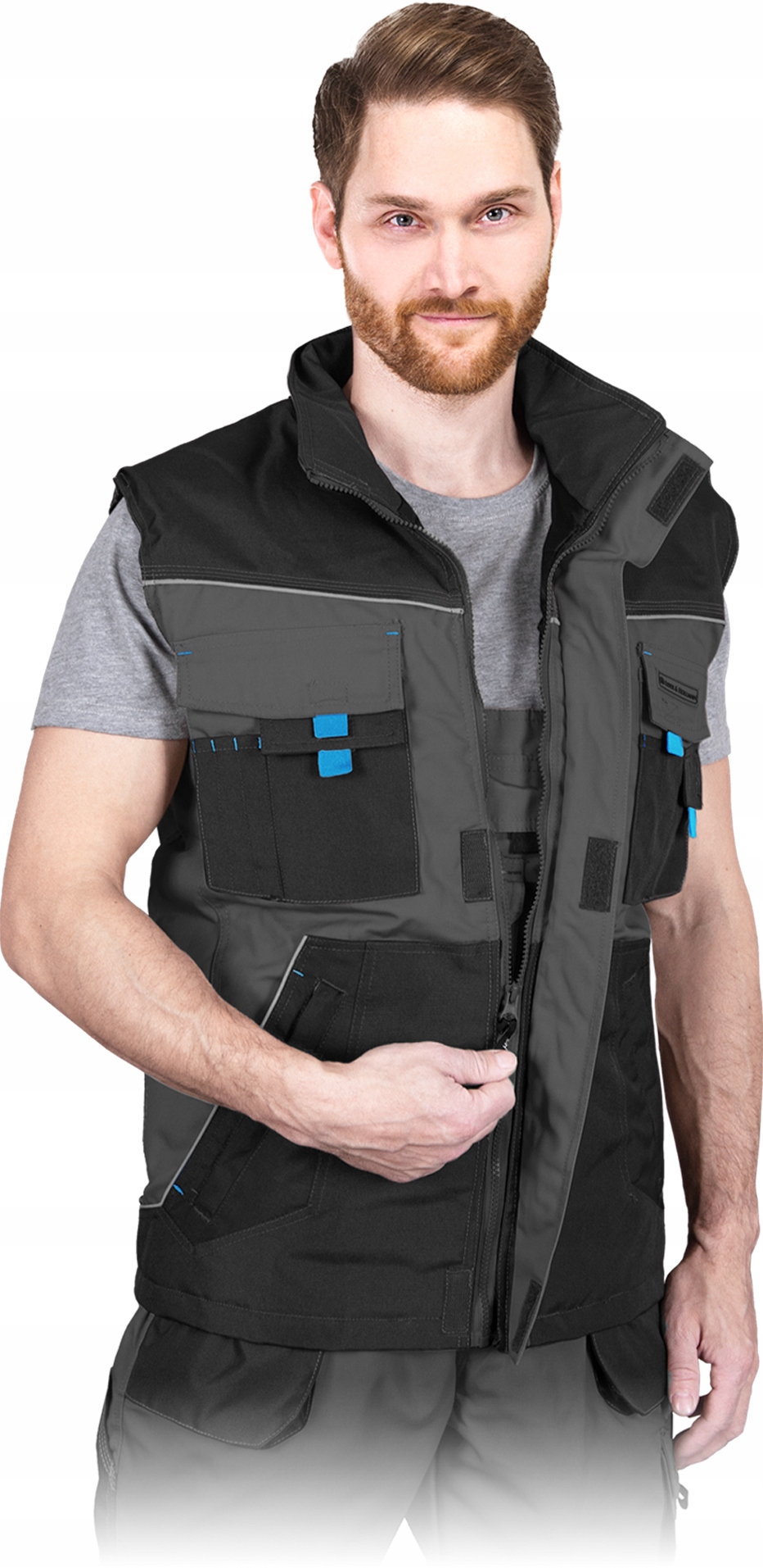 - na ramionach bezrękawnika wzmocnienie z czarnego materiału, co zwiększa jego wytrzymałość na przetarcia